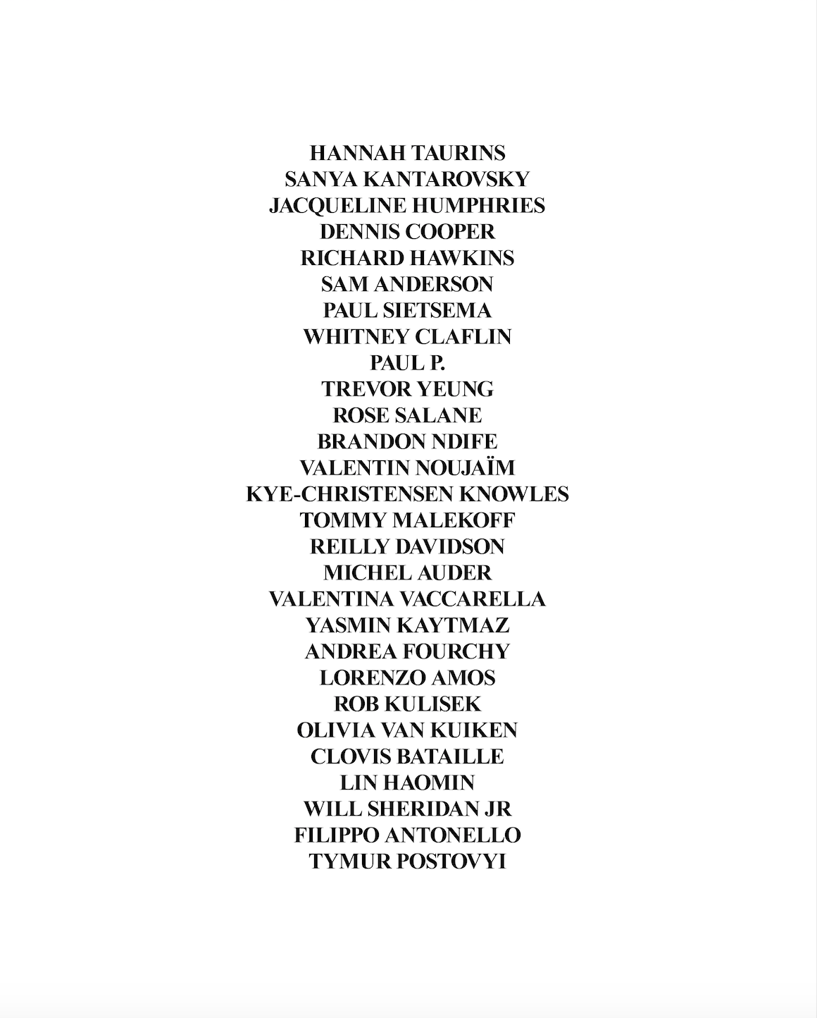Trevor Yeung, Sam Anderson, Rose Salane, Brandon Ndife, Valentin Noujaïm, Kye Christensen-Knowles, Paul Sietsema, Hannah Taurins, Paul P., Whitney Claflin, Sanya Kantarovsky, Mark Dion, Jacqueline Humphries, Dennis Cooper, Richard Hawkins, Tommy Malekoff, Reilly Davidson, Michel Auder, Valentina Vaccarella & Yasmin Kaytmaz, Andrea Fourchy, Lorenzo Amos, Rob Kulisek, Starck Club, Olivia Van Kuiken, Clovis Bataille, Lin Haomin, Will Sheridan Jr, Filippo Antonello, and Tymur Postovyi.